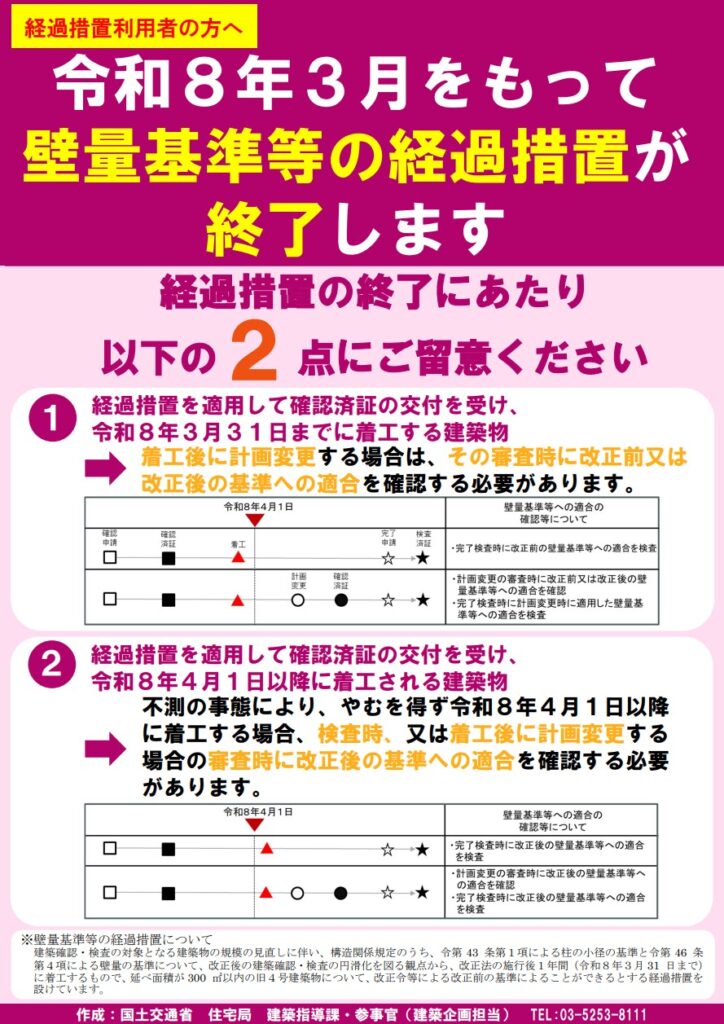 つまり、計画変更を行った場合や令和8年4月1日以降に着工した場合は改正後の基準への適合が必須で、適合していなければ確認済証や検査済証は公布されません。くれぐれもご注意ください。
