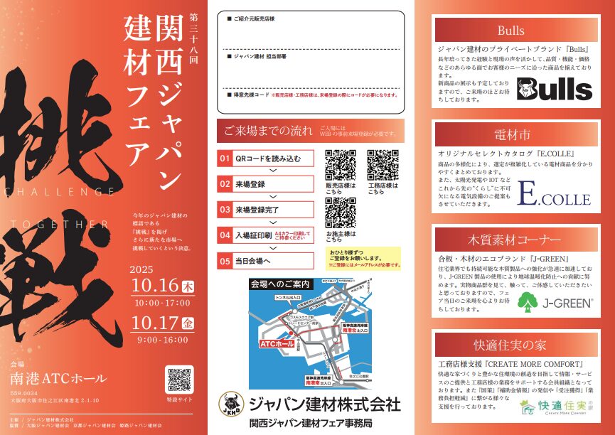 2025年10月16日(木)、10月17日(金)の2日間に、第38回関西ジャパン建材フェアに出展いたします。