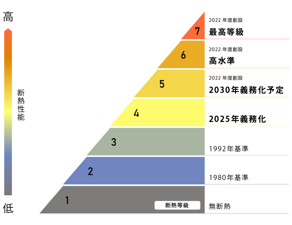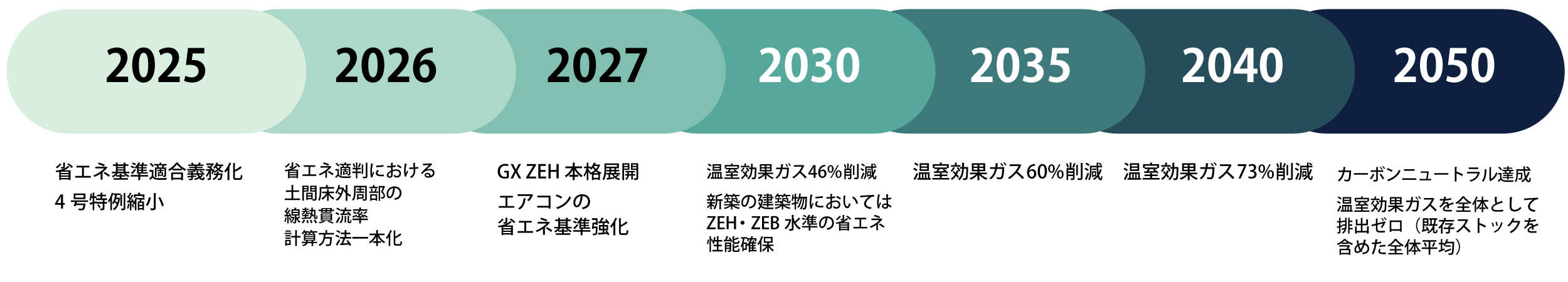 2023年4月に建築物省エネ法が改正。2025年4月からは原則、すべての建築物に省エネ基準への適合が義務付けられました。また、建築確認手続きの中で省エネ基準への適合性の審査が行われます。2050年カーボンニュートラルに向けて、今後はZEH・ZEB水準の省エネ性能の確保は必須になっていきます。